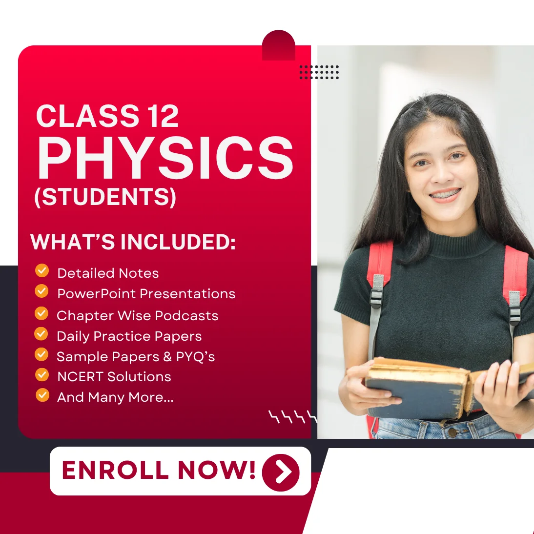 This expertly curated, concept-based course is designed to simplify the most challenging Physics topics, boost conceptual clarity, and ensure complete board exam preparation across Electrostatics, Magnetism, Current Electricity, Optics, Modern Physics, and more.